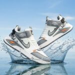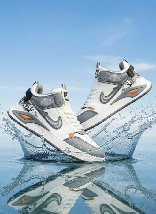 Design: Stylish white base with grey overlays, modern side detailing, and orange accent clips. Unique graphic artwork on the heel adds a premium streetwear vibe.