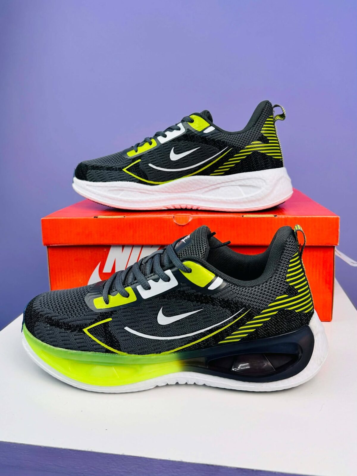 Design: Sporty, aerodynamic design with a neon green air sole accent and sleek side patterns.