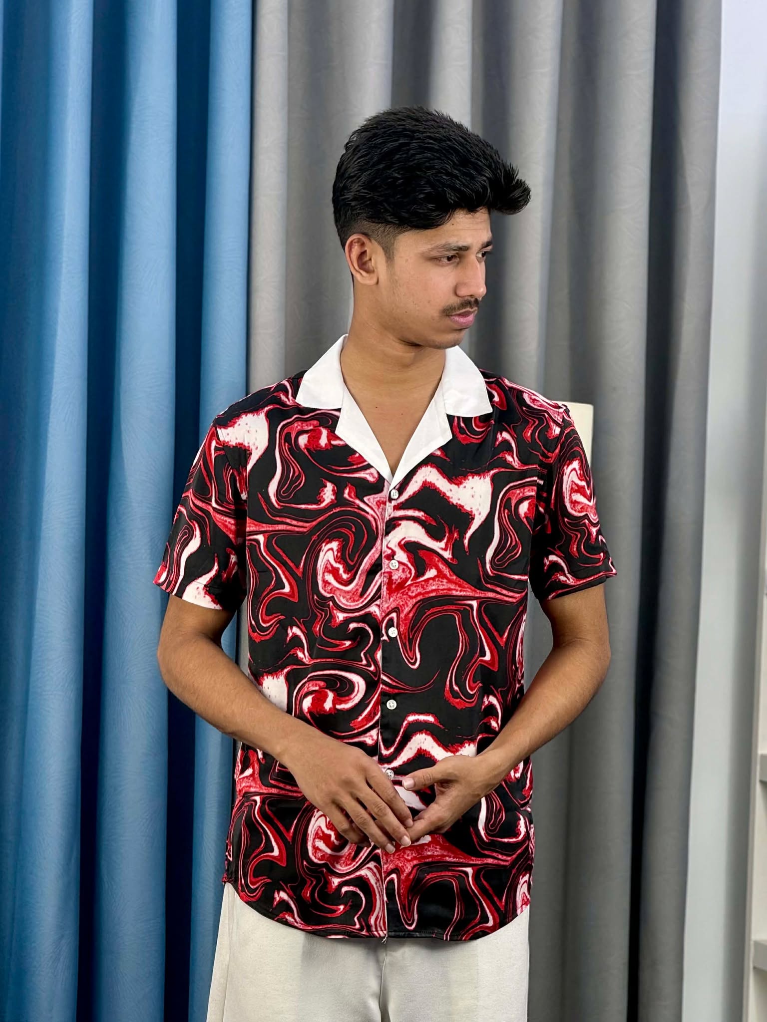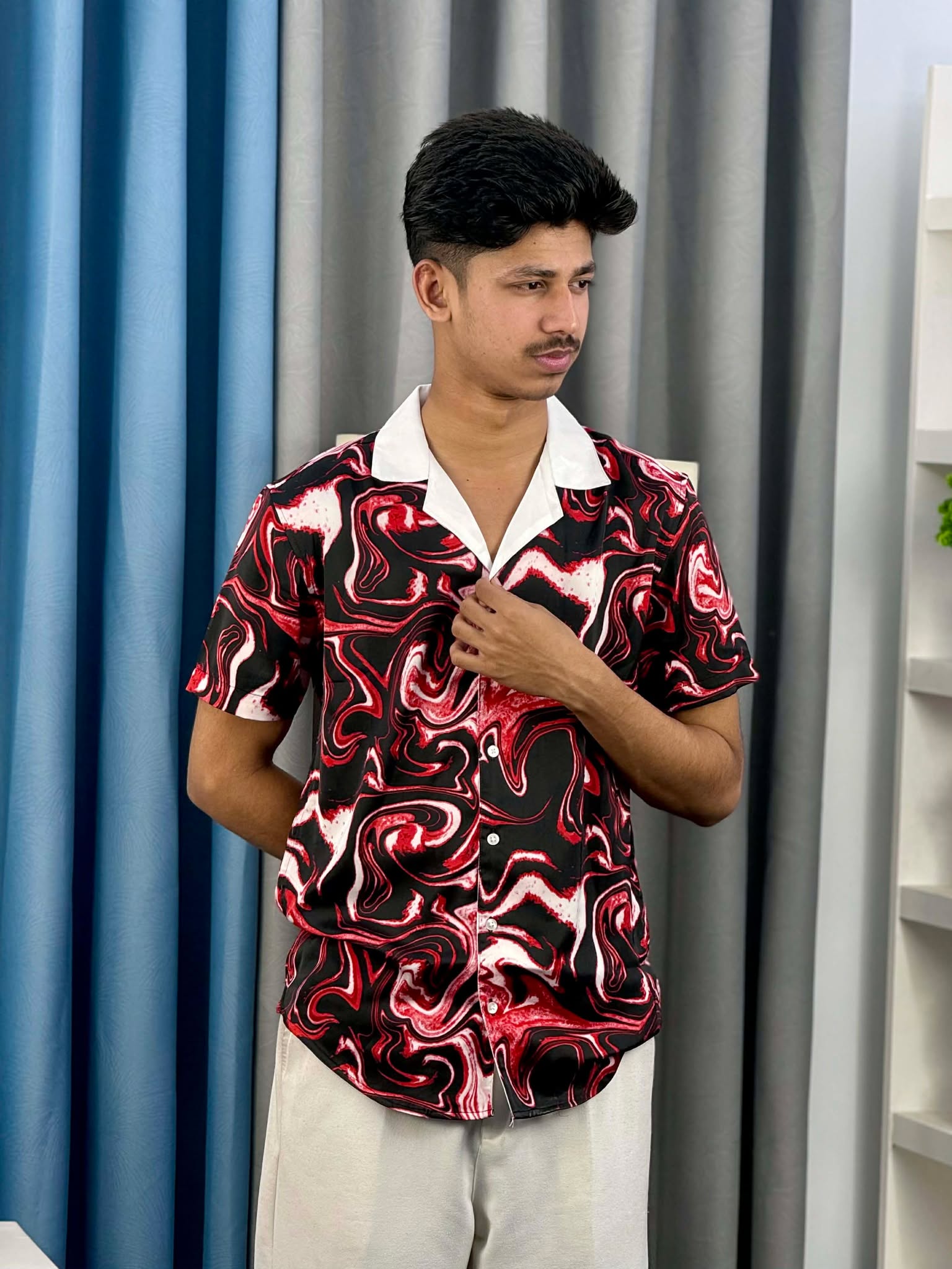 The attractive black and red marble print design creates a trendy and modern vibe, while the white contrast collar adds a unique and classy touch. Perfect for parties, hangouts, casual events, and special occasions.