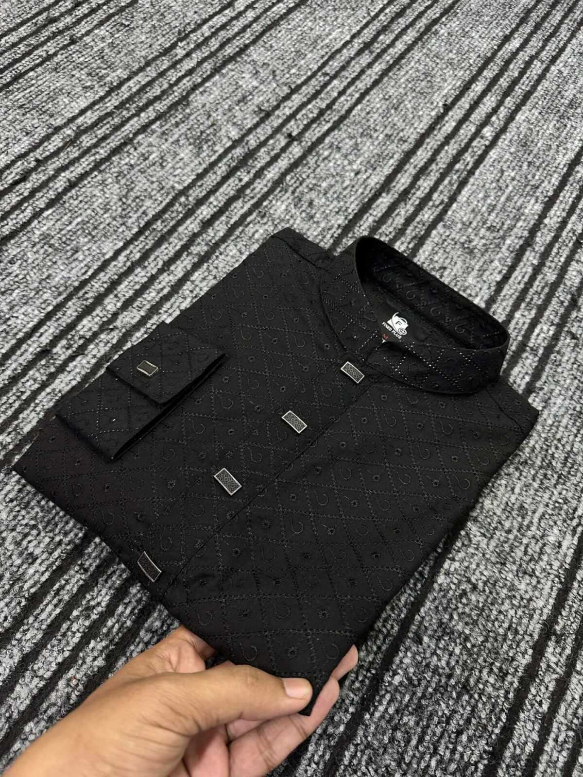 The Midnight Black Signature Chiken Panjabi is a timeless classic designed for those who prefer elegance with simplicity. Featuring subtle chikan embroidery in a refined geometric pattern, this panjabi delivers a sophisticated and graceful appearance. The deep black shade enhances the intricate embroidery, while the premium finishing and metallic buttons elevate the overall look—perfect for evening events, parties, and formal occasions.