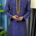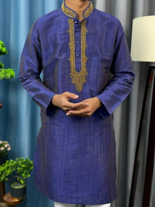 Add a touch of elegance and tradition to your festive wear with this beautifully designed Pester Katan Panjabi, featuring exquisite Karchopi embroidery on the neckline and front panel. The detailed golden threadwork enhances the rich look of the outfit, making it a perfect choice for Eid, weddings, cultural events, and special occasions.