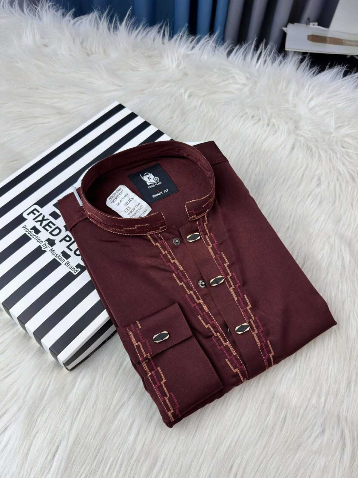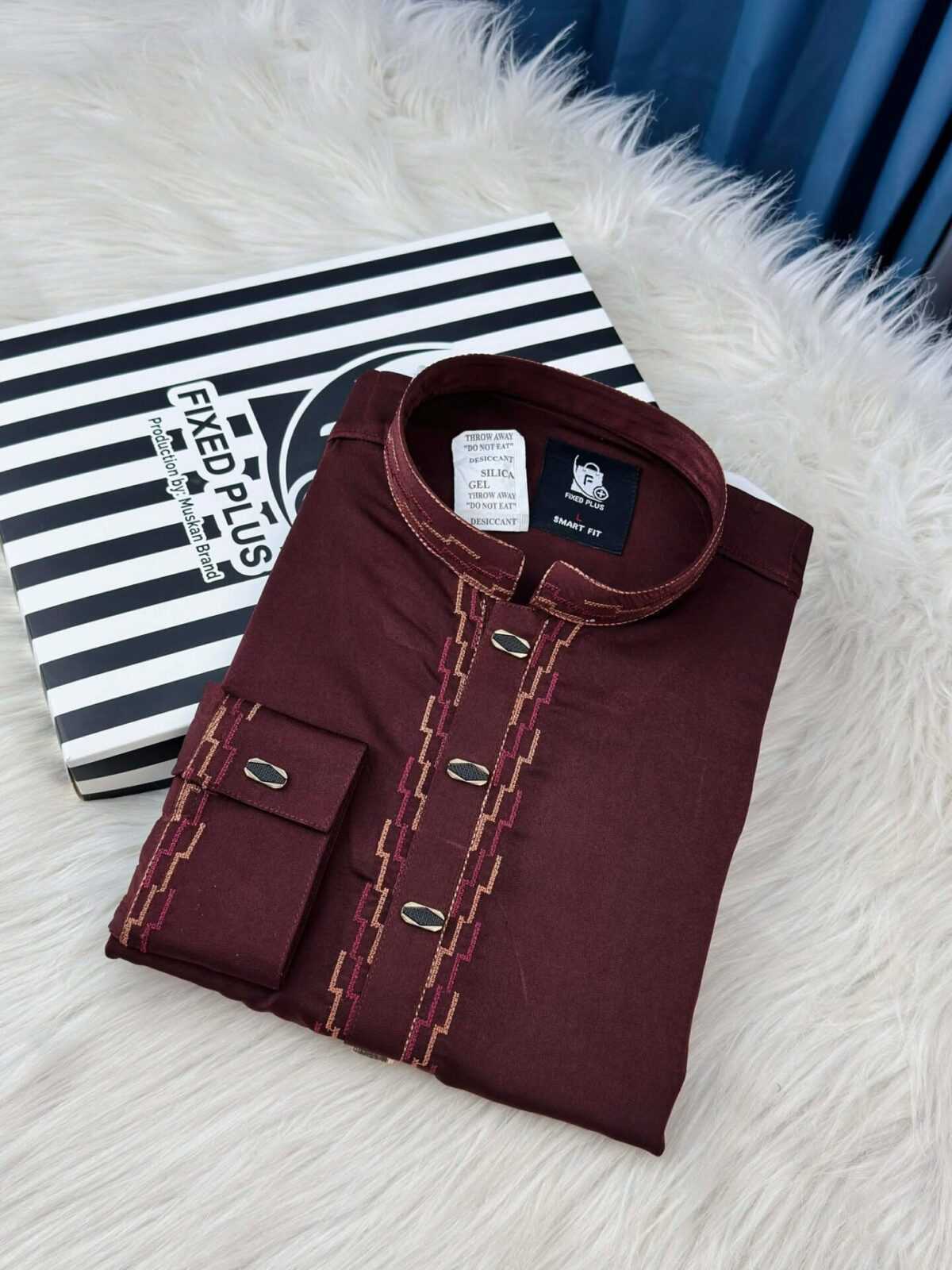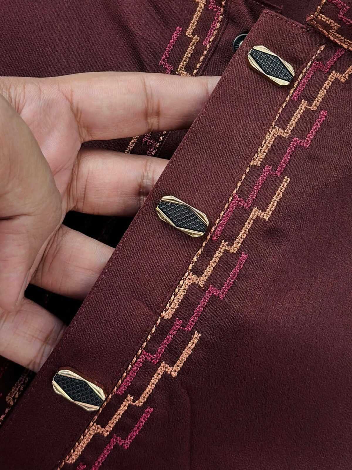Deep maroon color with elegant contrast embroidery