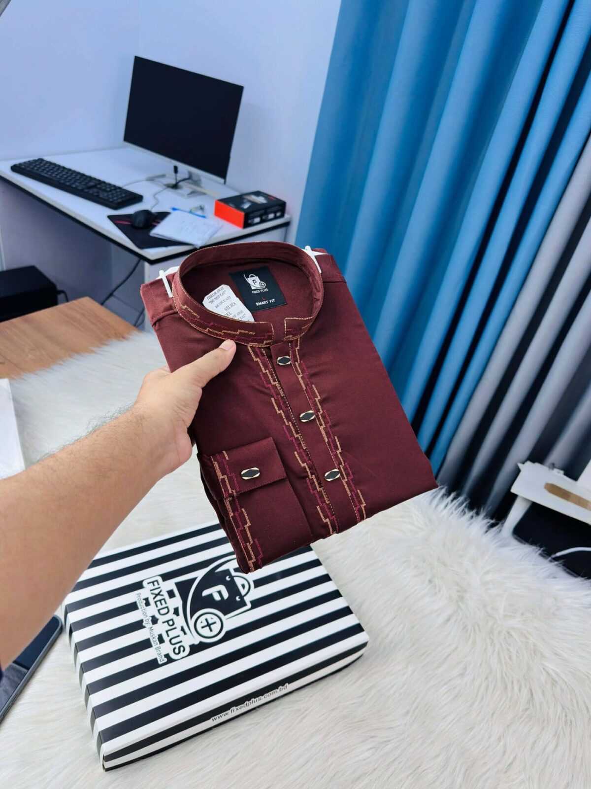 The Premium Classic Maroon Panjabi combines rich color with long-lasting durability. Crafted from blended polyester fabric, it offers wrinkle resistance and maintains its shape while delivering a premium finish.