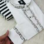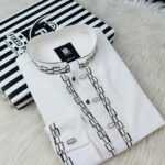 Contrast embroidered patterns on the placket, collar, and cuffs