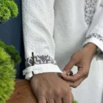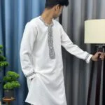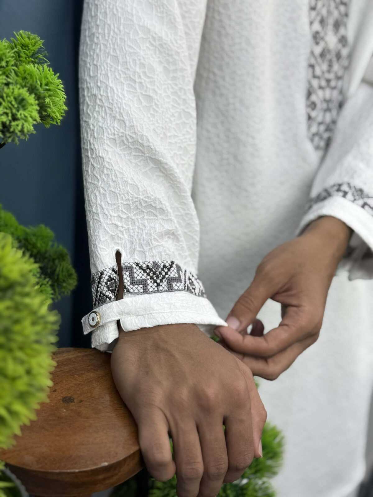 Designed with a modern round neck and a stylish cuff system, this Panjabi features eye-catching geometric embroidery on the chest placket and cuffs. The front zipper design adds a contemporary touch while maintaining a classic traditional vibe.