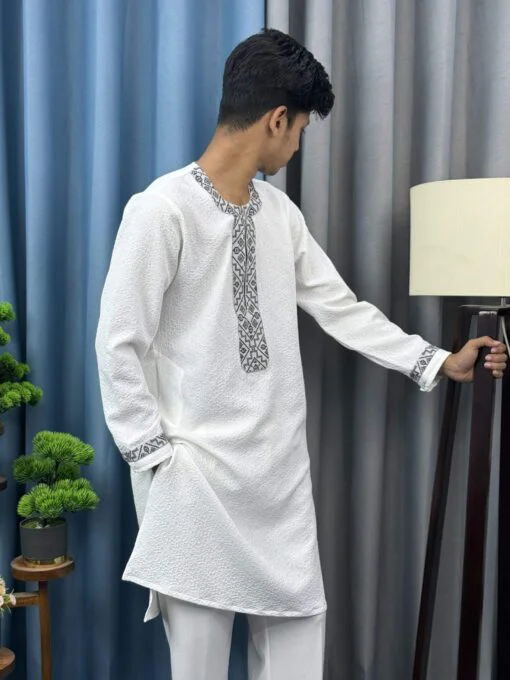 Elevate your traditional style with this elegant white Panjabi crafted from premium China Imported Popcorn Texture fabric. The unique textured material offers a soft feel, breathable comfort, and a refined look perfect for any occasion.