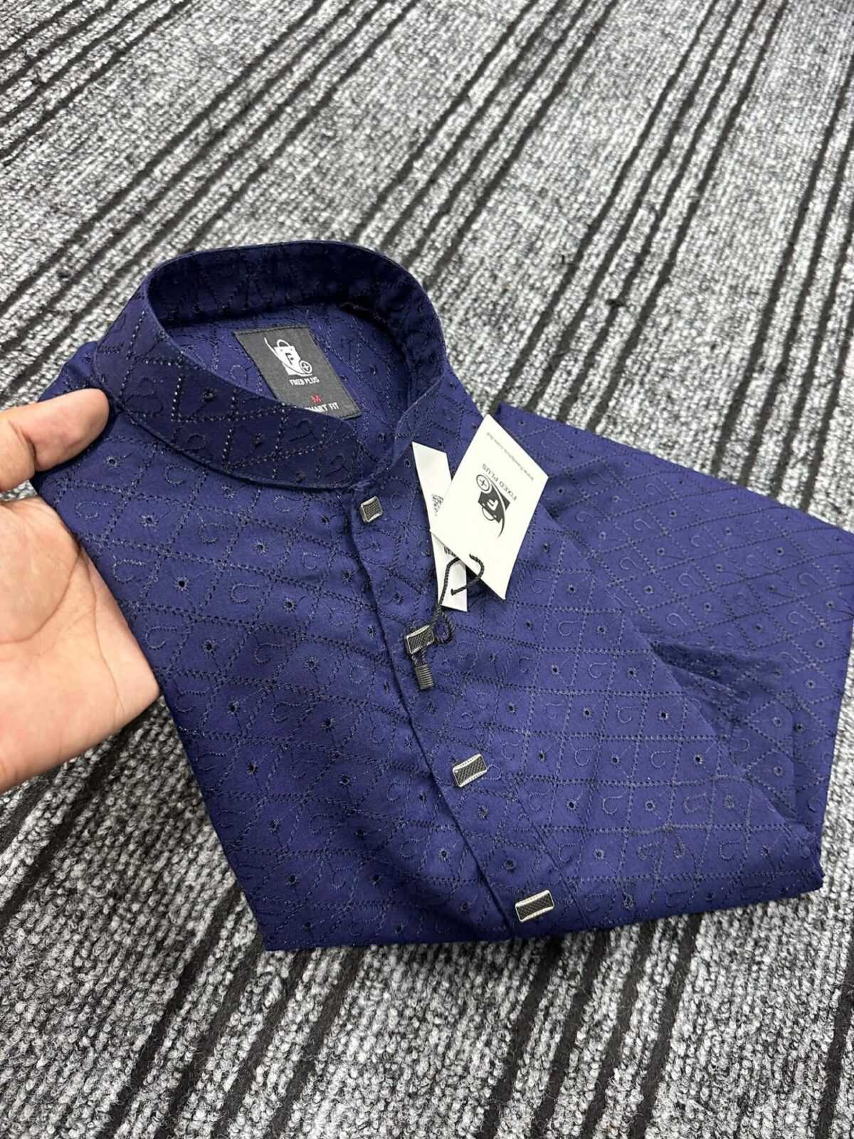 Step into refined tradition with the Royal Navy Blue Chiken Panjabi. Designed with detailed chikan embroidery across the entire fabric, this panjabi offers a perfect blend of classic craftsmanship and modern fashion. The deep navy blue color adds richness and depth, making it suitable for Eid, family programs, cultural events, and festive celebrations. Finished with premium stitching and decorative metallic buttons for a polished look.