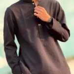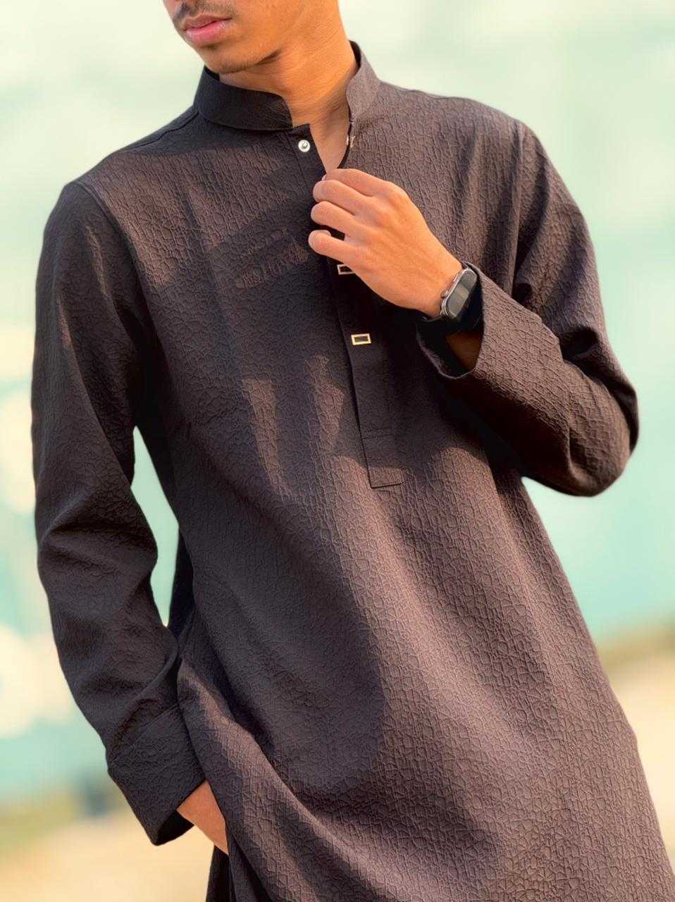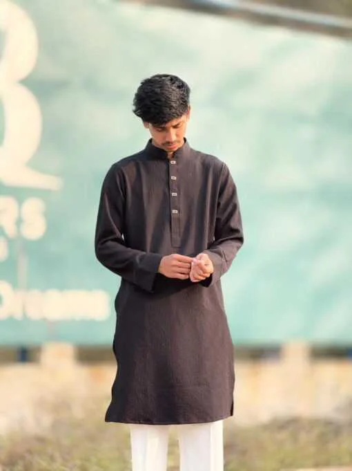 The Royal Weave Panjabi – Black Edition is crafted with a refined traditional design, enriched by premium detailing and modern tailoring. This Panjabi features a subtle woven texture, elegant metallic buttons, and a sophisticated cufflinks cuff design, making it a perfect choice for formal and festive occasions.