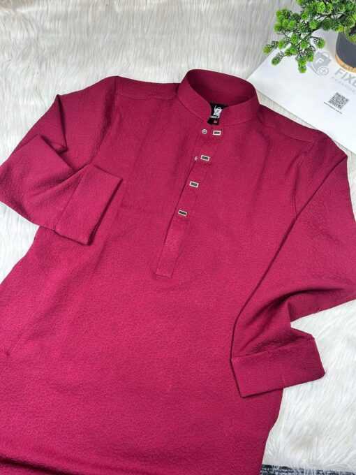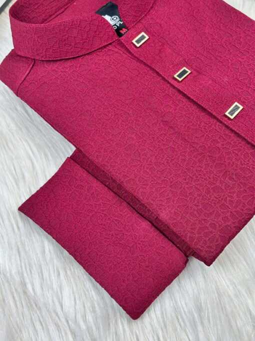 The Royal Weave Panjabi – Maroon Edition is crafted with a refined traditional design, enriched by premium detailing and modern tailoring. This Panjabi features a subtle woven texture, elegant metallic buttons, and a sophisticated cufflinks cuff design, making it a perfect choice for formal and festive occasions.