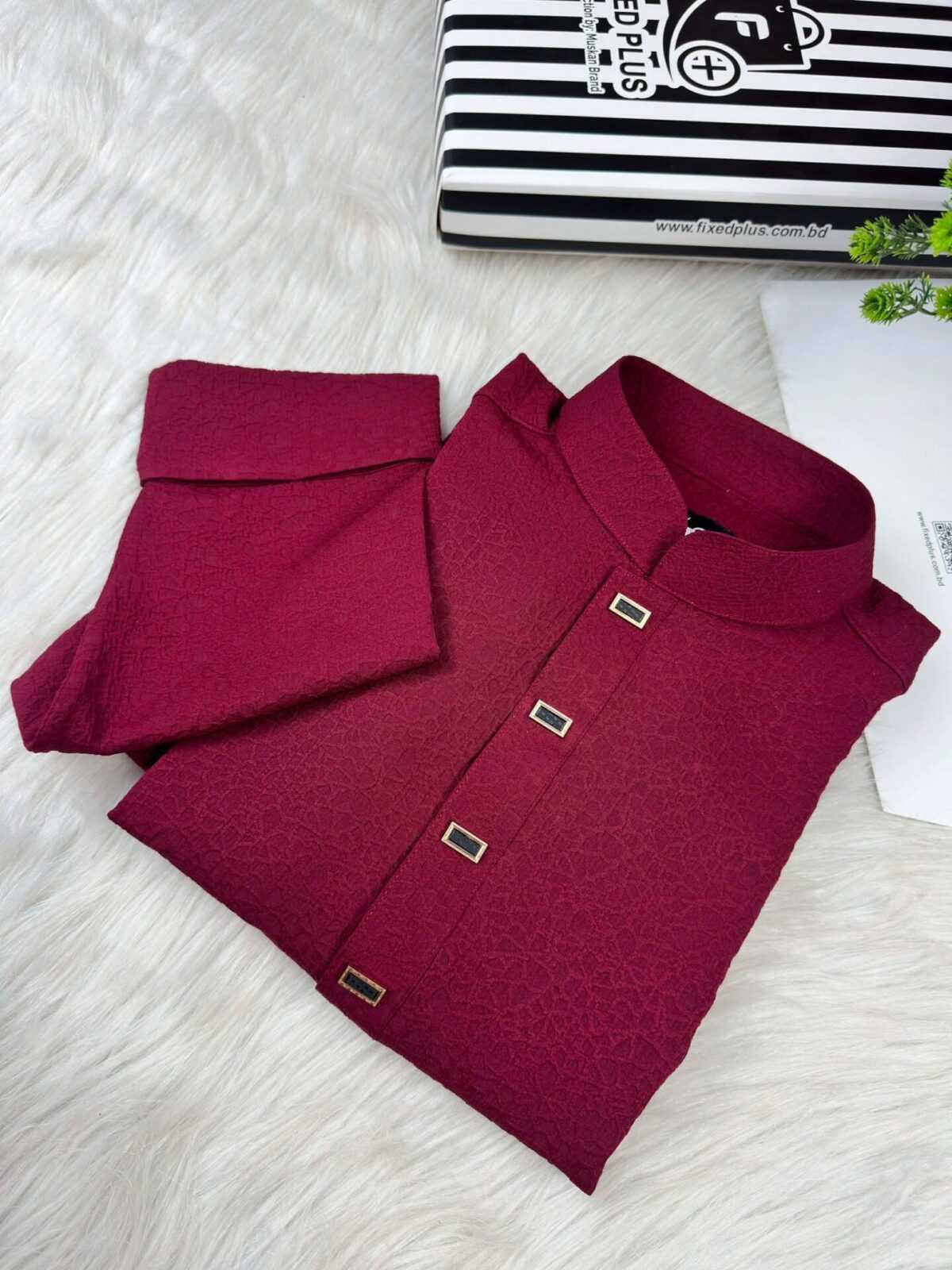 The Royal Weave Panjabi – Maroon Edition is crafted with a refined traditional design, enriched by premium detailing and modern tailoring. This Panjabi features a subtle woven texture, elegant metallic buttons, and a sophisticated cufflinks cuff design, making it a perfect choice for formal and festive occasions.