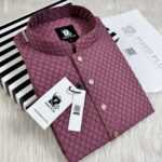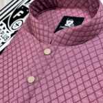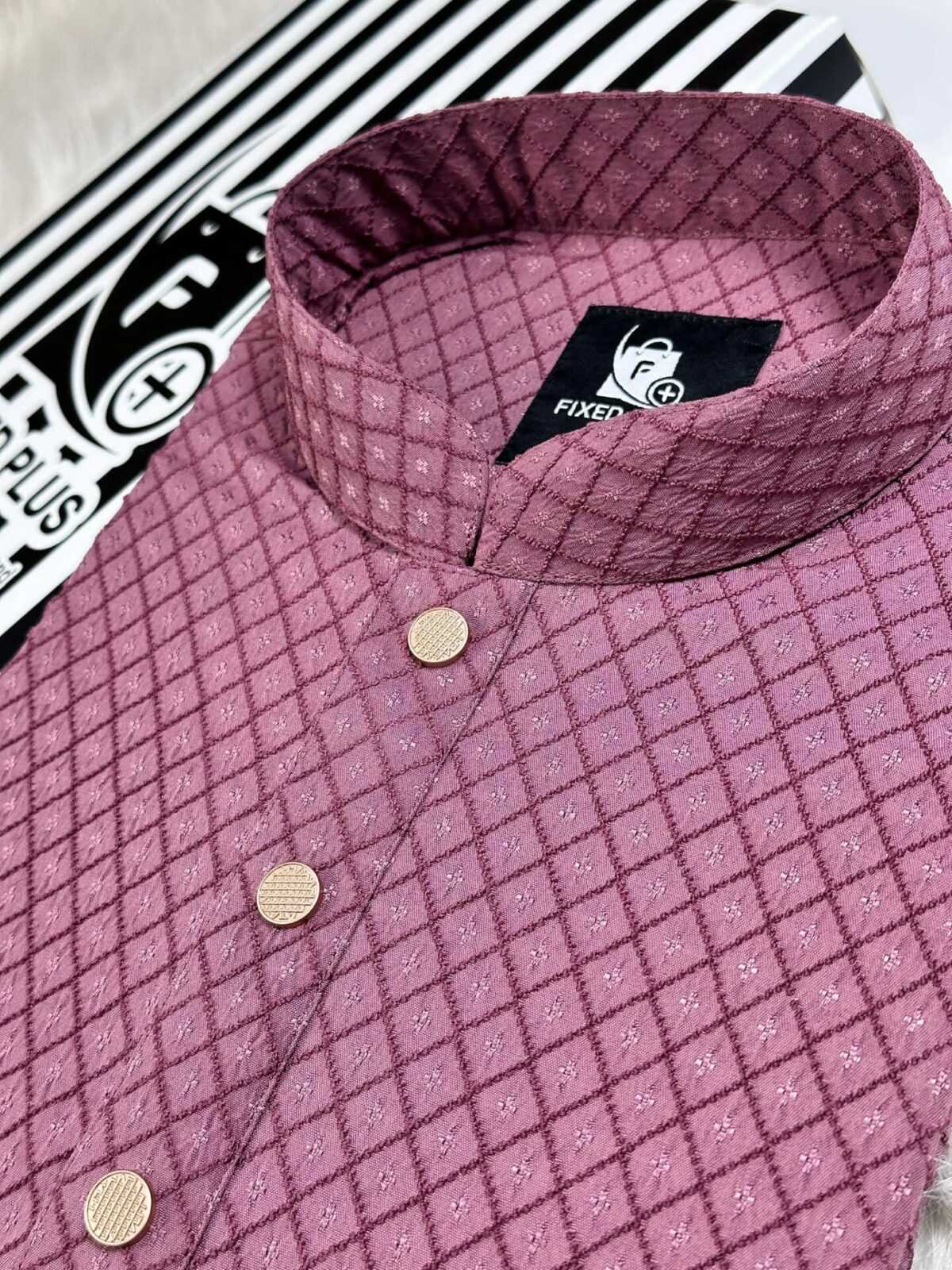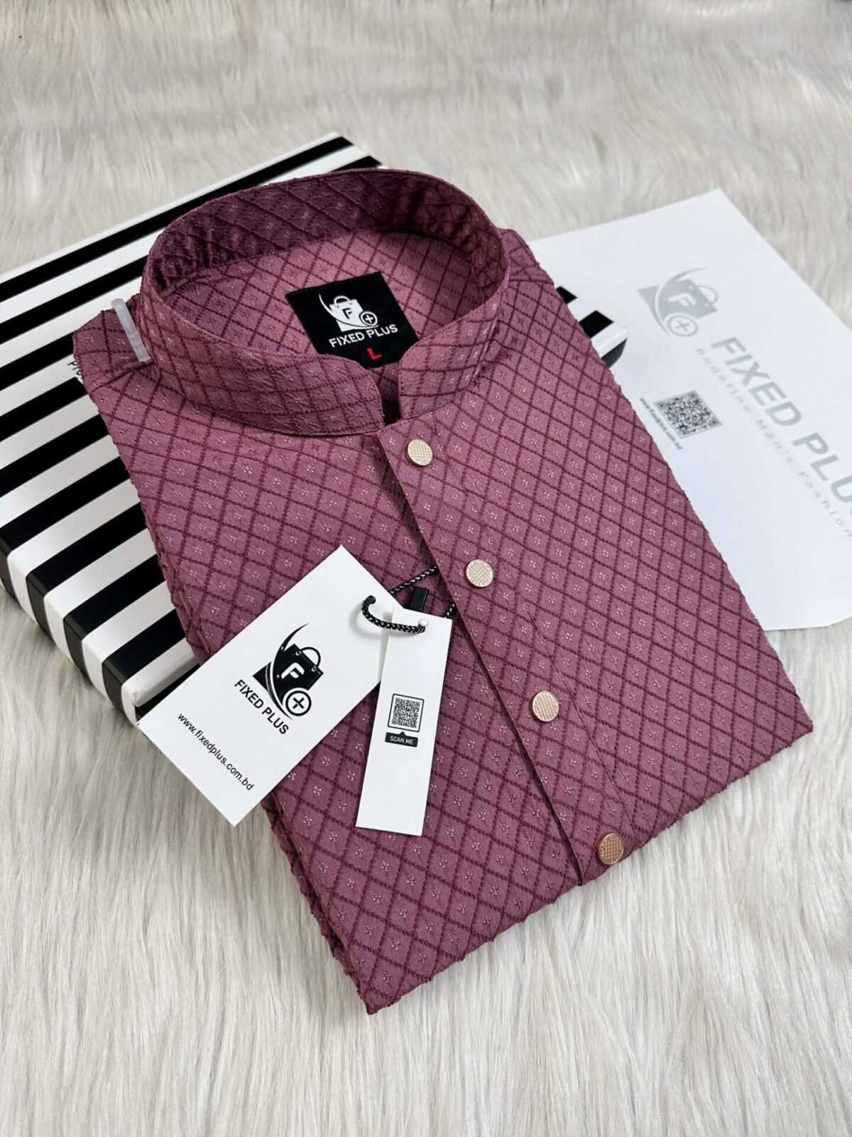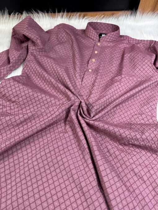 This panjabi showcases a classy diamond-weave texture throughout the body, giving it a modern yet traditional appearance. The soft dusty rose shade offers a unique and fashionable look, complemented by a structured band collar and elegant gold-tone buttons.