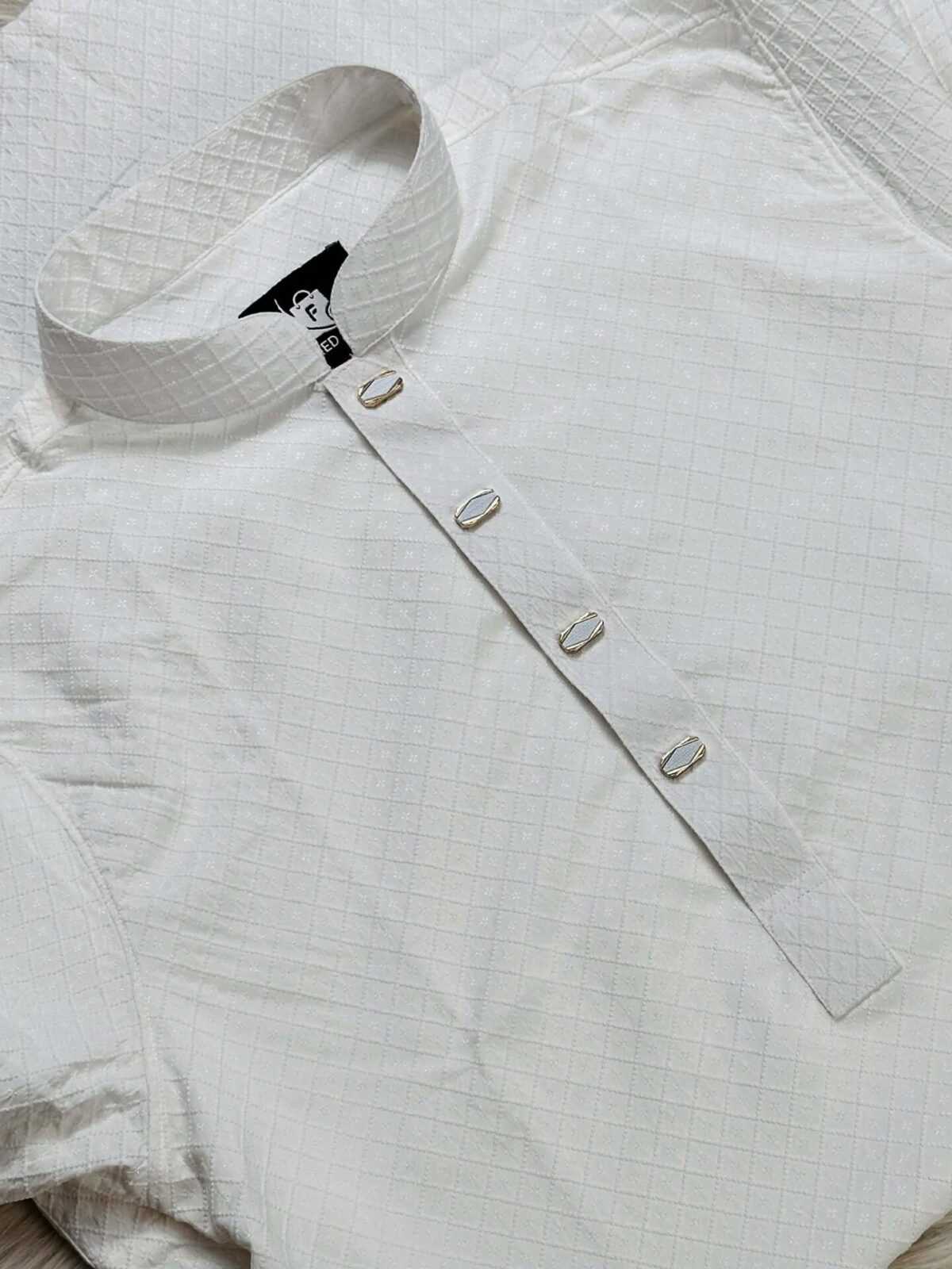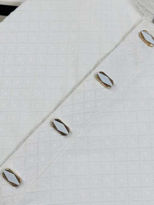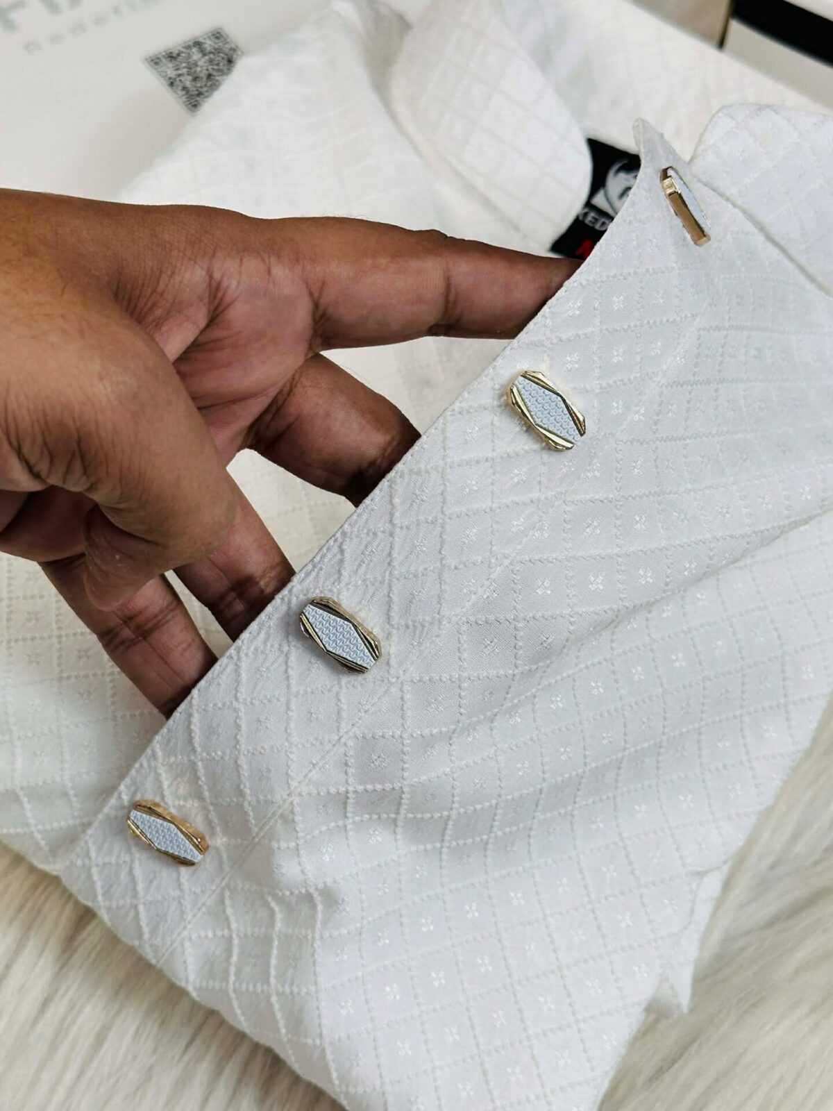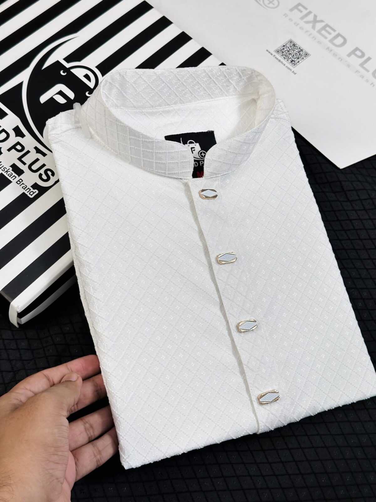 The Fixed Plus Premium Textured Panjabi – White Edition represents elegance, purity, and timeless style. Designed with a subtle diamond-texture pattern and finished with premium buttons, this Panjabi is perfect for traditional wear with a modern premium feel.