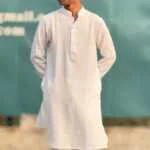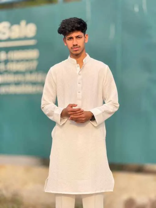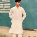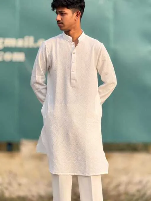 The Royal Weave Panjabi – White Edition is crafted with a refined traditional design, enriched by premium detailing and modern tailoring. This Panjabi features a subtle woven texture, elegant metallic buttons, and a sophisticated cufflinks cuff design, making it a perfect choice for formal and festive occasions.
