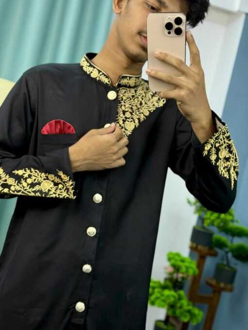 Design: Elegant sherwani-inspired cut with heavy golden embroidery on cuffs & collar, decorative metal buttons, and red pocket square.