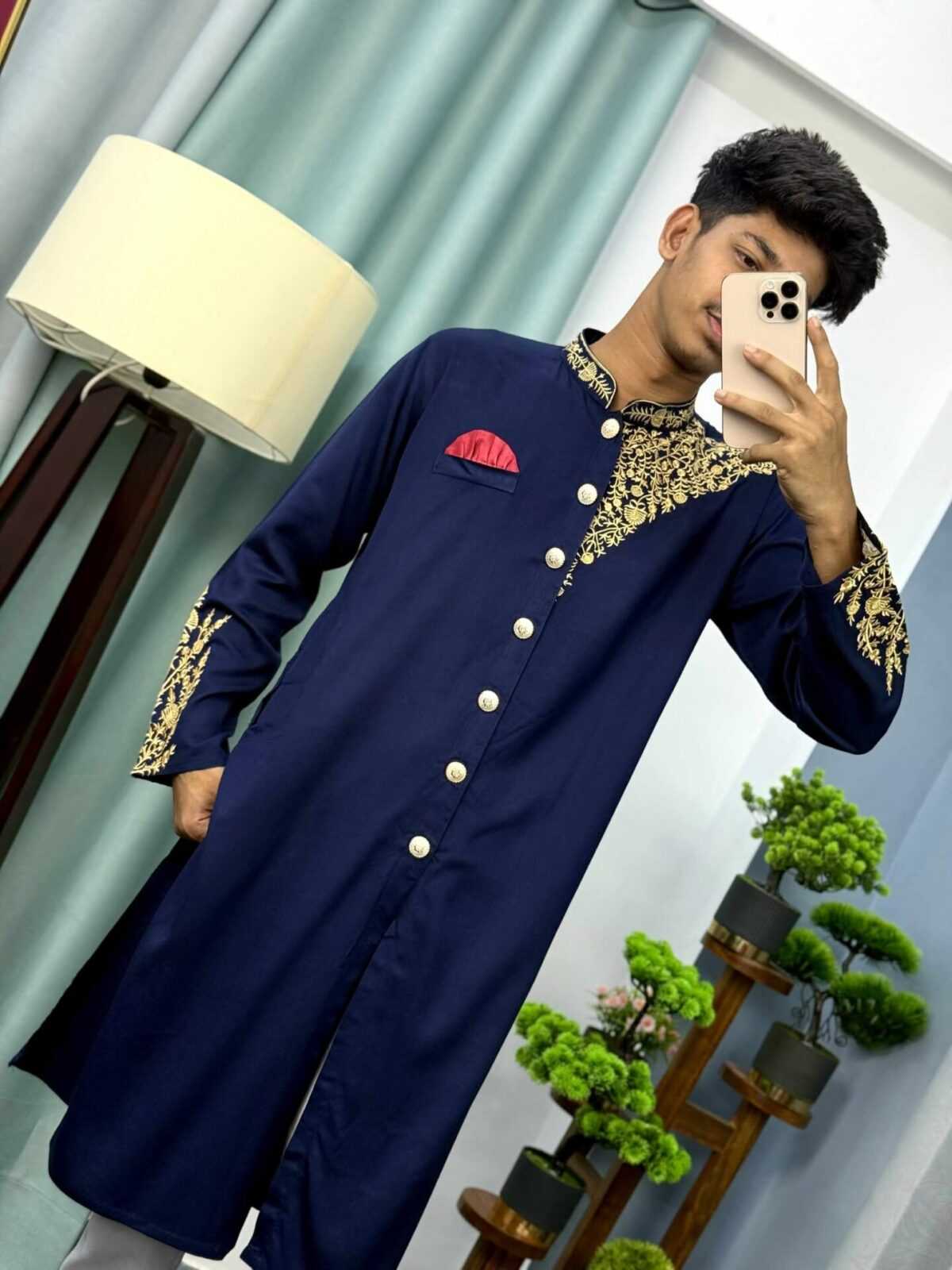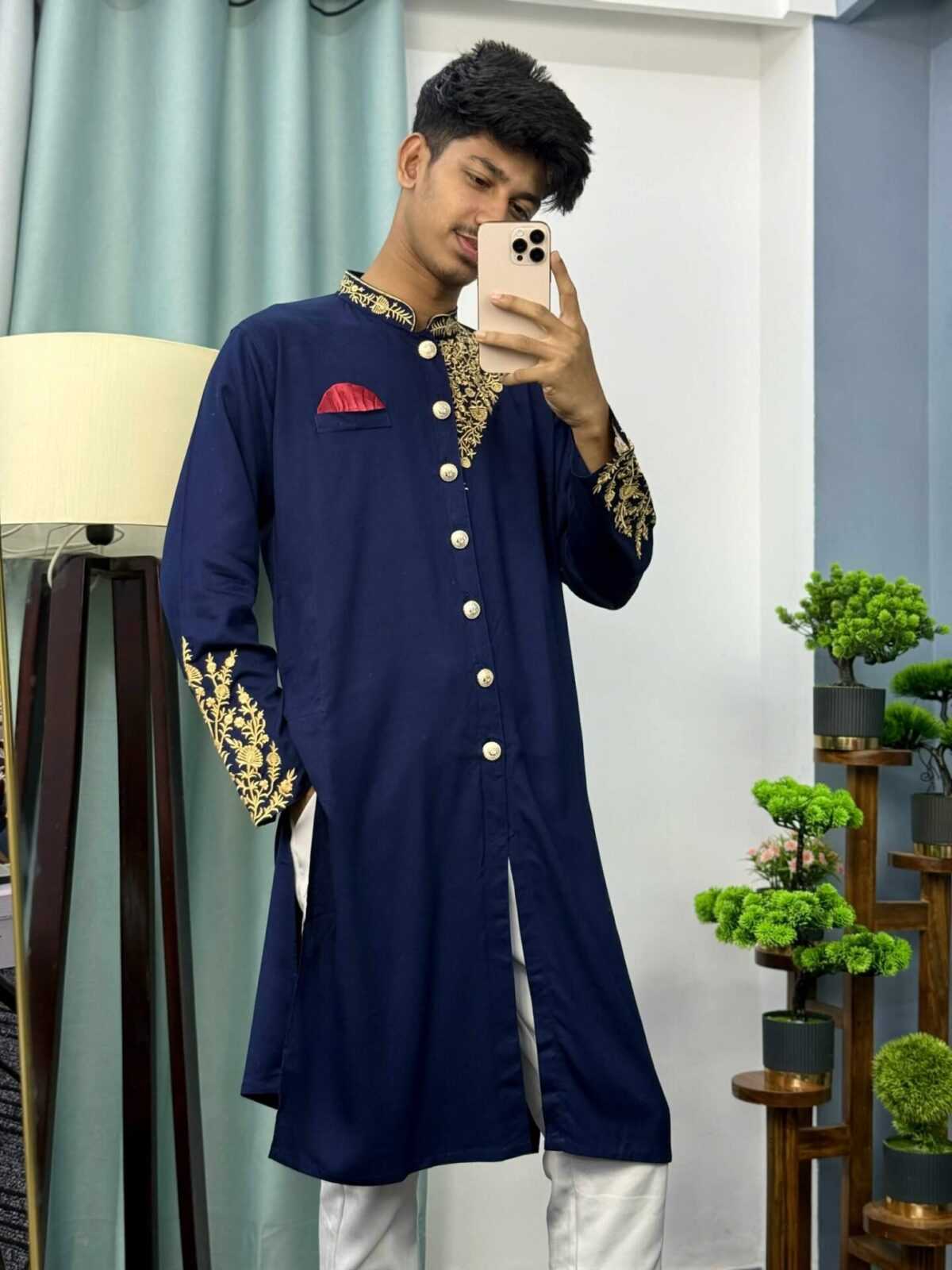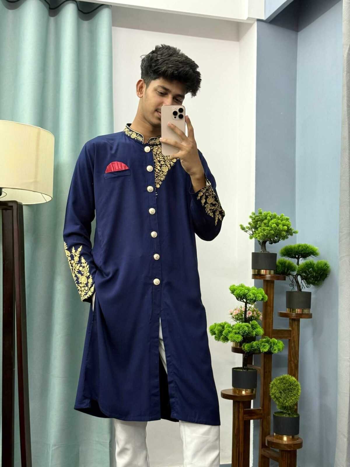 Its sherwani-style front cut and modern slim-fit tailoring provide a sleek silhouette, ensuring you stand out in any crowd. Whether it’s a wedding, cultural celebration, or festive gathering, this kurta will make you look regal and confident.