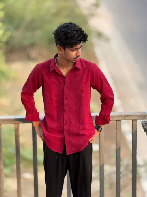 The Urban Weave Classic Shirt – Crimson Red is designed to make a confident style statement. Crafted from premium China Ambush Fabric, this shirt features a rich textured pattern that enhances its bold maroon tone. Perfect for men who want a standout yet classy look for special occasions or stylish daily wear.