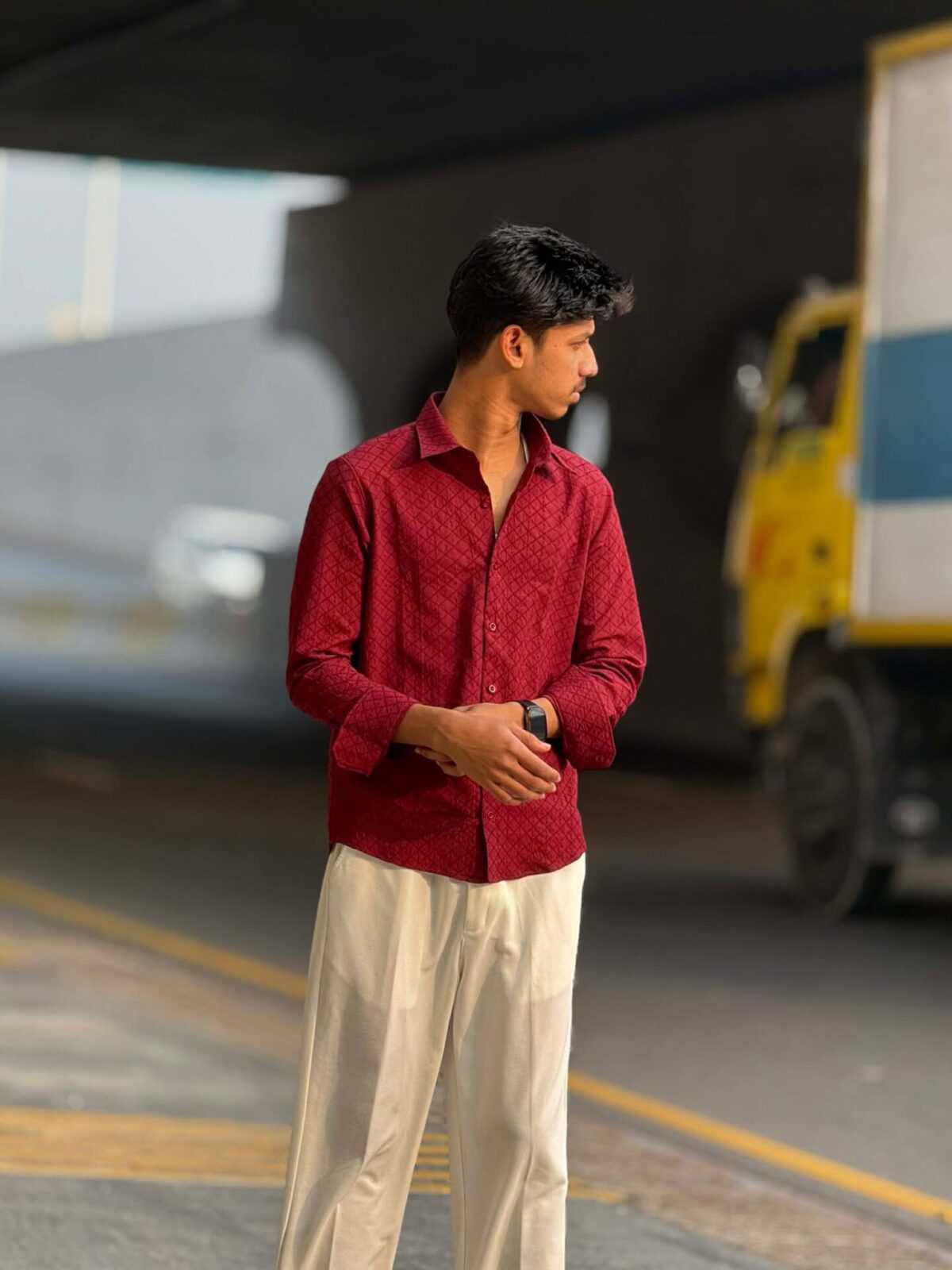 The Urban Weave Classic Shirt – Maroon Red is designed to make a confident style statement. Crafted from premium China Ambush Fabric, this shirt features a rich textured pattern that enhances its bold maroon tone. Perfect for men who want a standout yet classy look for special occasions or stylish daily wear.