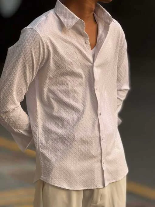 The Urban Weave Classic Shirt – Ivory Cream is designed for men who prefer a clean, elegant, and modern look. Crafted with premium China Ambush Fabric, this shirt features a subtle diamond-textured pattern that adds depth and sophistication. The light ivory tone delivers a fresh and refined appearance, making it ideal for both casual and semi-formal occasions.
